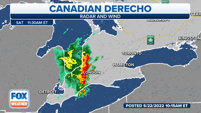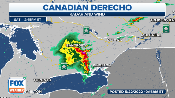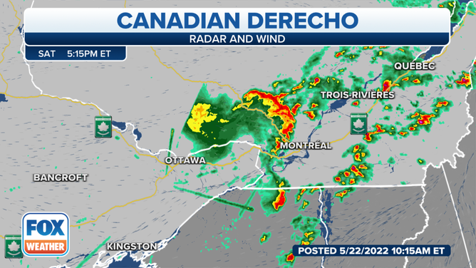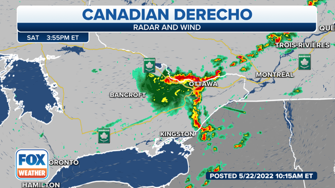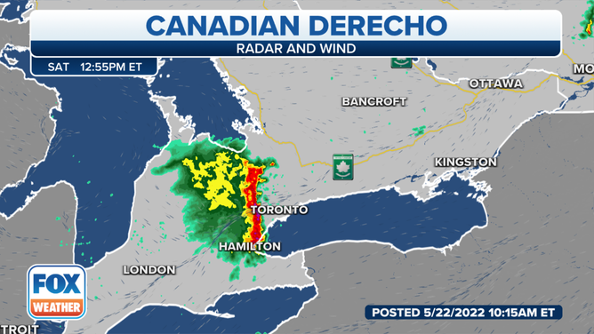 The city of Kitchener in southeastern Ontario clocked the highest wind gust at 82 mph. Ottawa and Toronto recorded peak gusts of 75 mph.