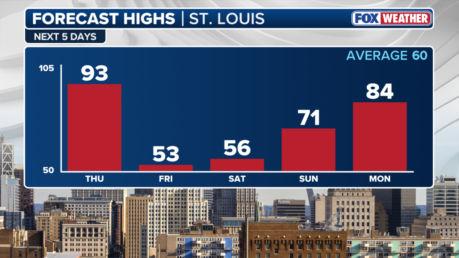 According to the FOX Forecast Center, ahead of the cold front, a surge of warm and above-average temperatures will impact St. Louis, MO to New York City on Thursday. Some areas will reach the 70s and 80s.