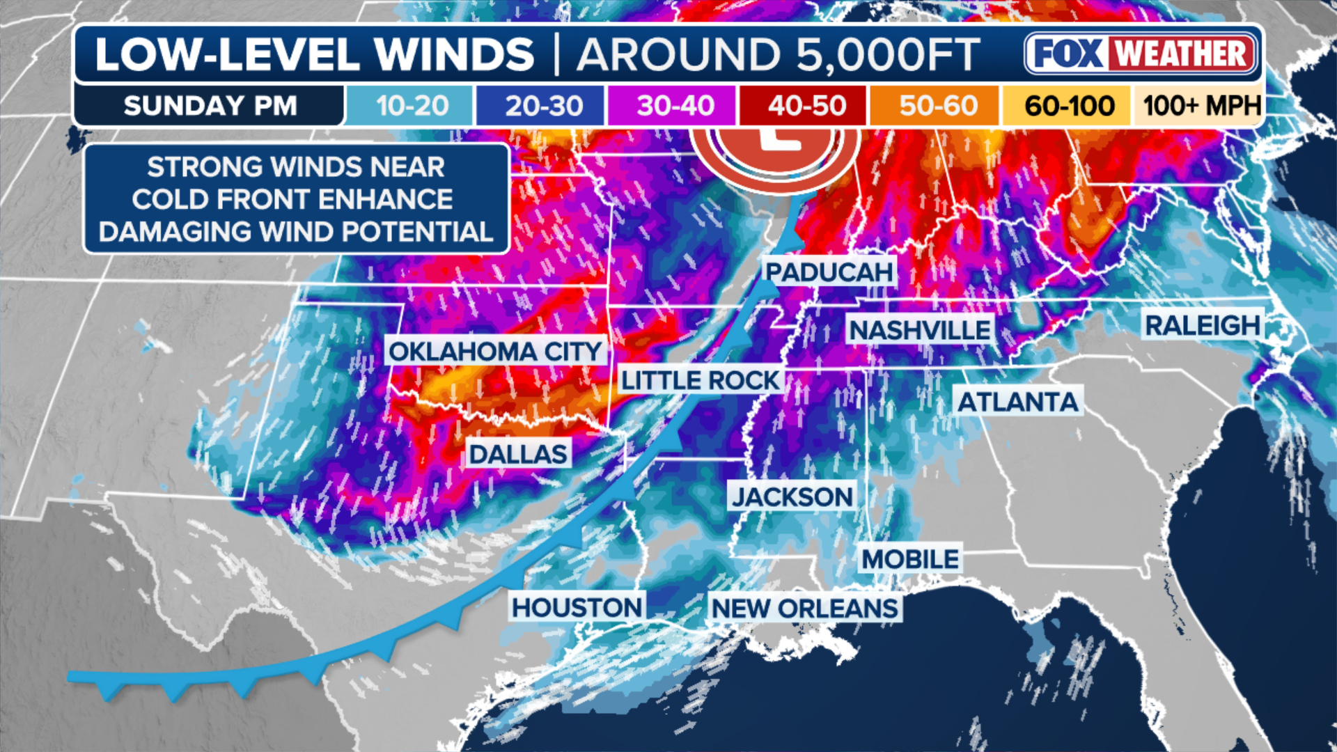 Starting Sunday, an area of low pressure will strengthen, allowing surface winds to increase ahead of the cold front.