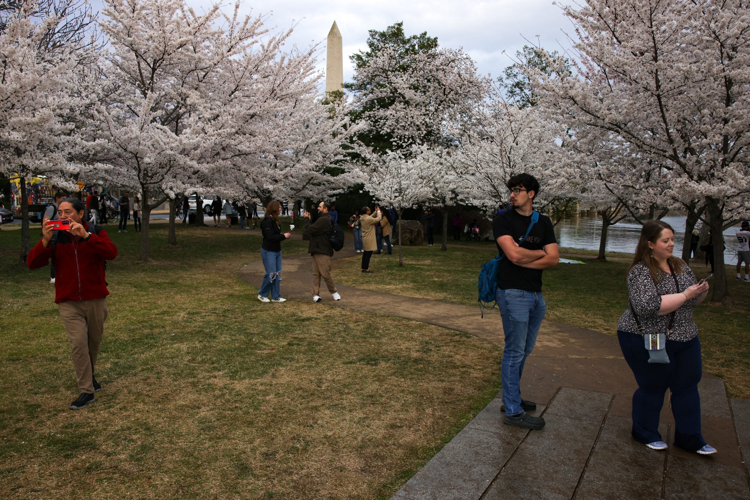 People visit the cherry blossom trees during their peak bloom stage at the Tidal Basin in Washington, D.C. on March 28, 2025.