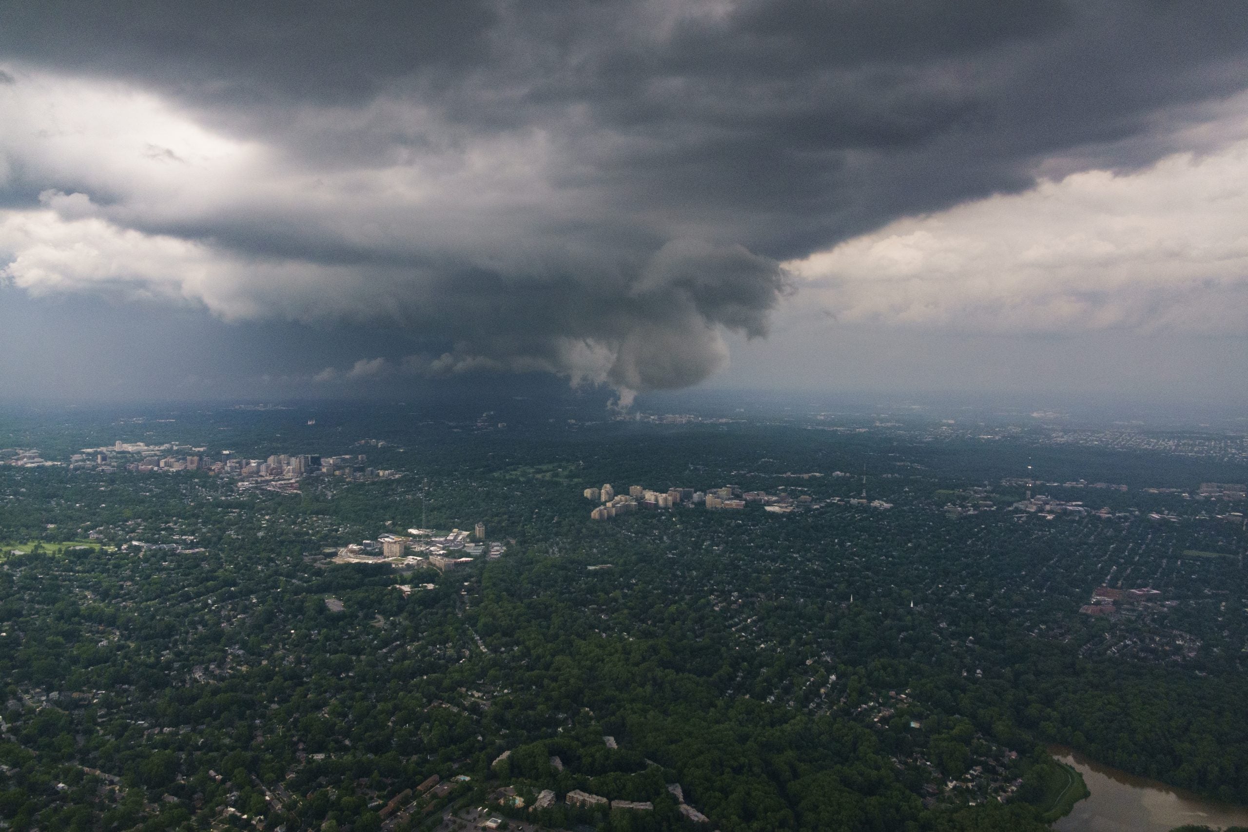 BETHESDA, MARYLAND - MAY 16: In an aerial view, severe thunderstorms move through the Washington, D.C. metropolitan area causing widespread damage on May 16, 2025, in Bethesda, Maryland.