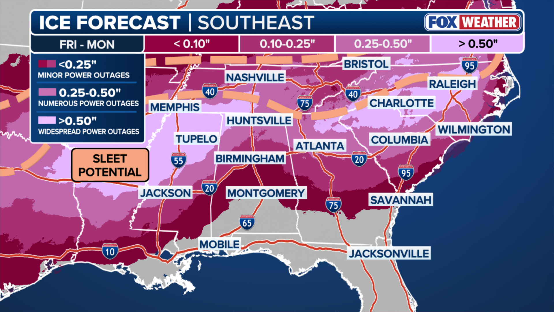 Significant ice accretion is a primary concern for southern states, with many regions facing accumulations greater than half an inch, which are capable of creating widespread power outages.