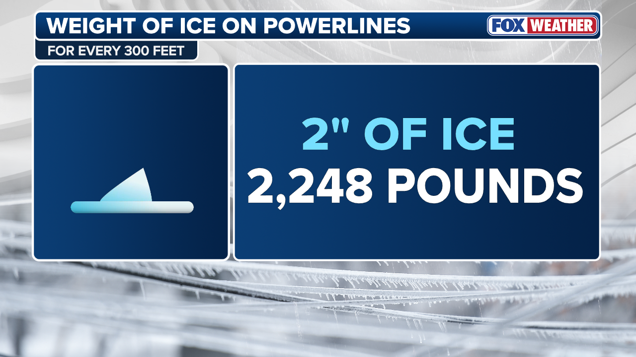 According to the FOX Forecast Center, 2 inches of ice is an additional 2,248 pounds across 300 feet of power lines — roughly the equivalent of a compact sedan hanging from the wires.