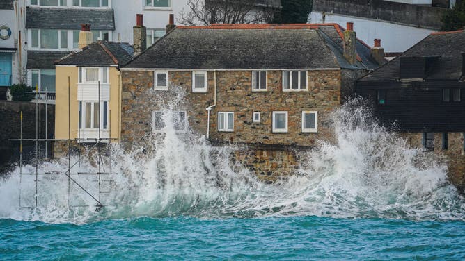 Waves strike waterfront properties in the harbour on April 09, 2024 in St Ives, Cornwall, England. On Monday, the Met Office issued severe weather warnings for wind across the southern and western coasts of England and Wales, effective until Tuesday afternoon. This follows the turbulent weather over the weekend, when Storm Kathleen, combined with high tides, generated massive waves along the Cornish coast. (Photo by Hugh Hastings/Getty Images)