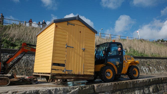 Volunteers use a fork lift vehicle to reposition beach huts at Castle Beach the day after three beach huts were swept into the sea on the previous evening high tide, on April 09, 2024 in Falmouth, England. On Monday, the Met Office issued severe weather warnings for wind across the southern and western coasts of England and Wales, effective until Tuesday afternoon. This follows the turbulent weather over the weekend, when Storm Kathleen, combined with high tides, generated massive waves along the Cornish coast. (Photo by Hugh Hastings/Getty Images)