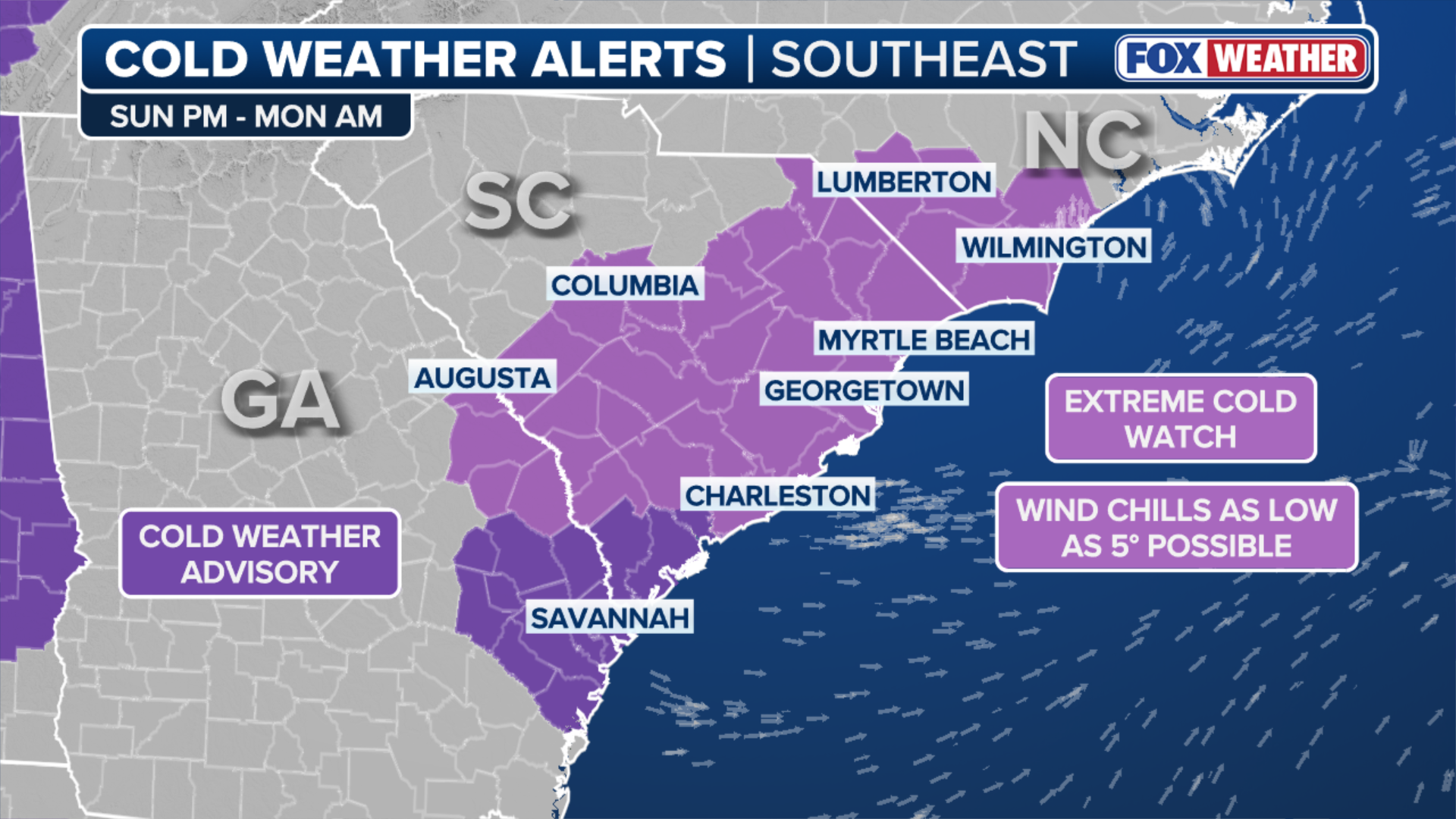 In the Southeast, and Extreme cold Watch is in effect beginning Sunday morning from Eastern Georgia through the Carolinas and a cold weather advisory is in place for part of Southeastern Georgia and Southwestern South Carolina.