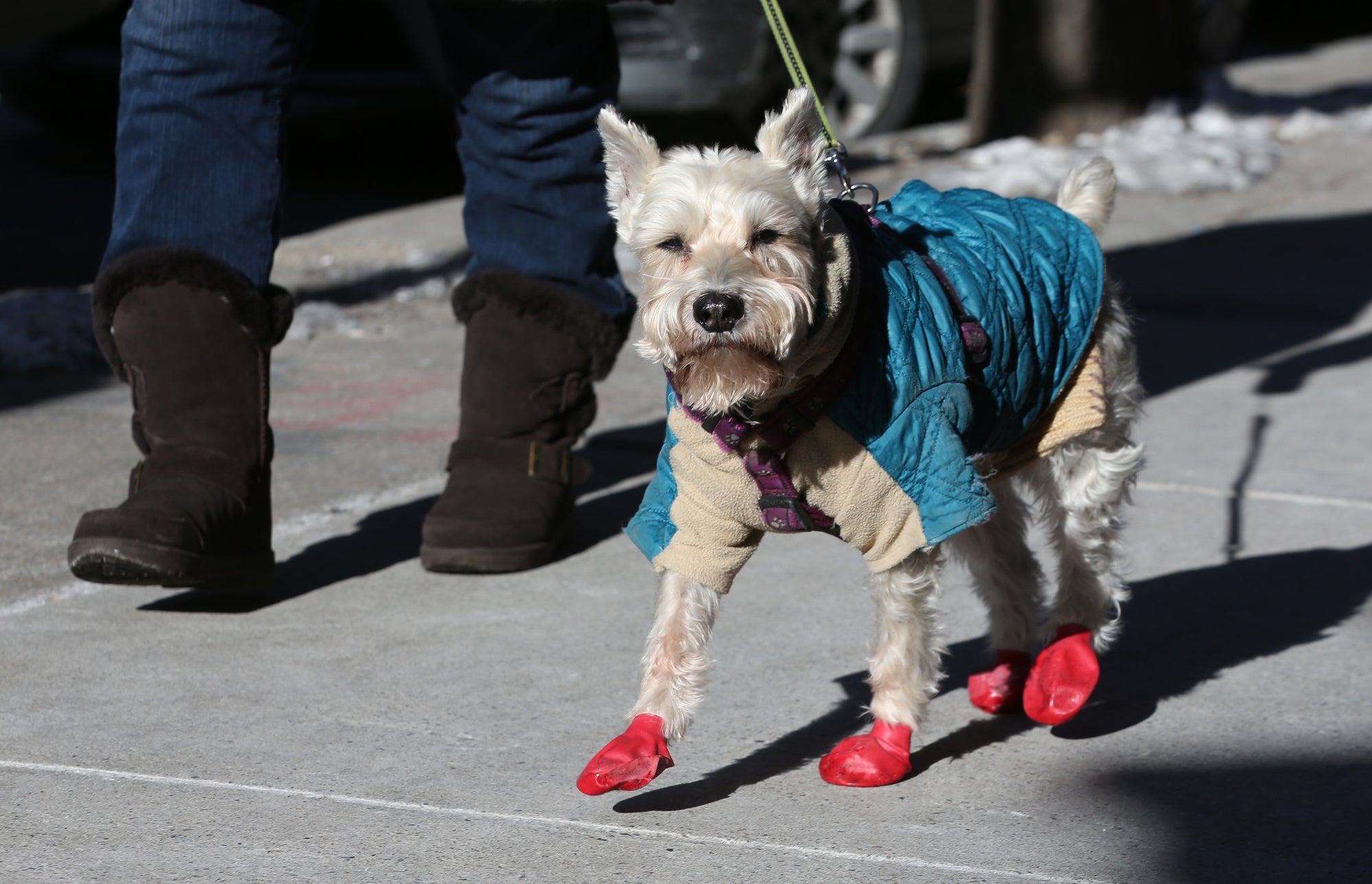 (Boston, MA - 1/2/18) A dog wearing a jacket and booties takes a walk in Chinatown as temperatures hover just above single digits, Tuesday, January 02, 2018.