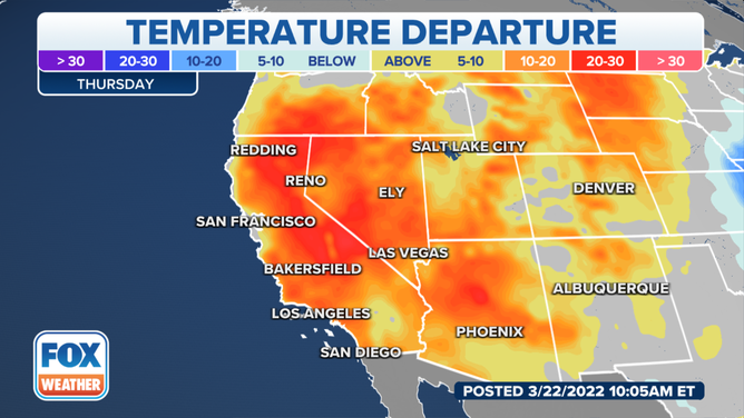 Temperatures across Oregon, California, Nevada and Arizona will experience highs 10-30 degrees above average through Thursday.
