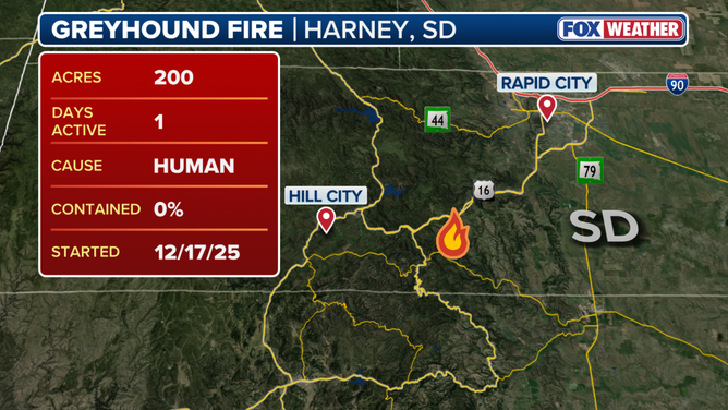 The Greyhound Fire in South Dakota spans 200 acres.