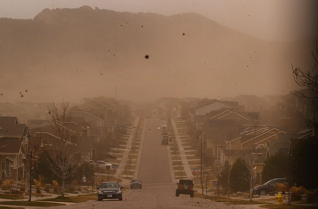 ARVADA, CO- DECEMBER 17: Dust and debris blow through the Leyden Rock subdivision during a strong windstorm in Arvada, Colo., on Dec. 17, 2025.