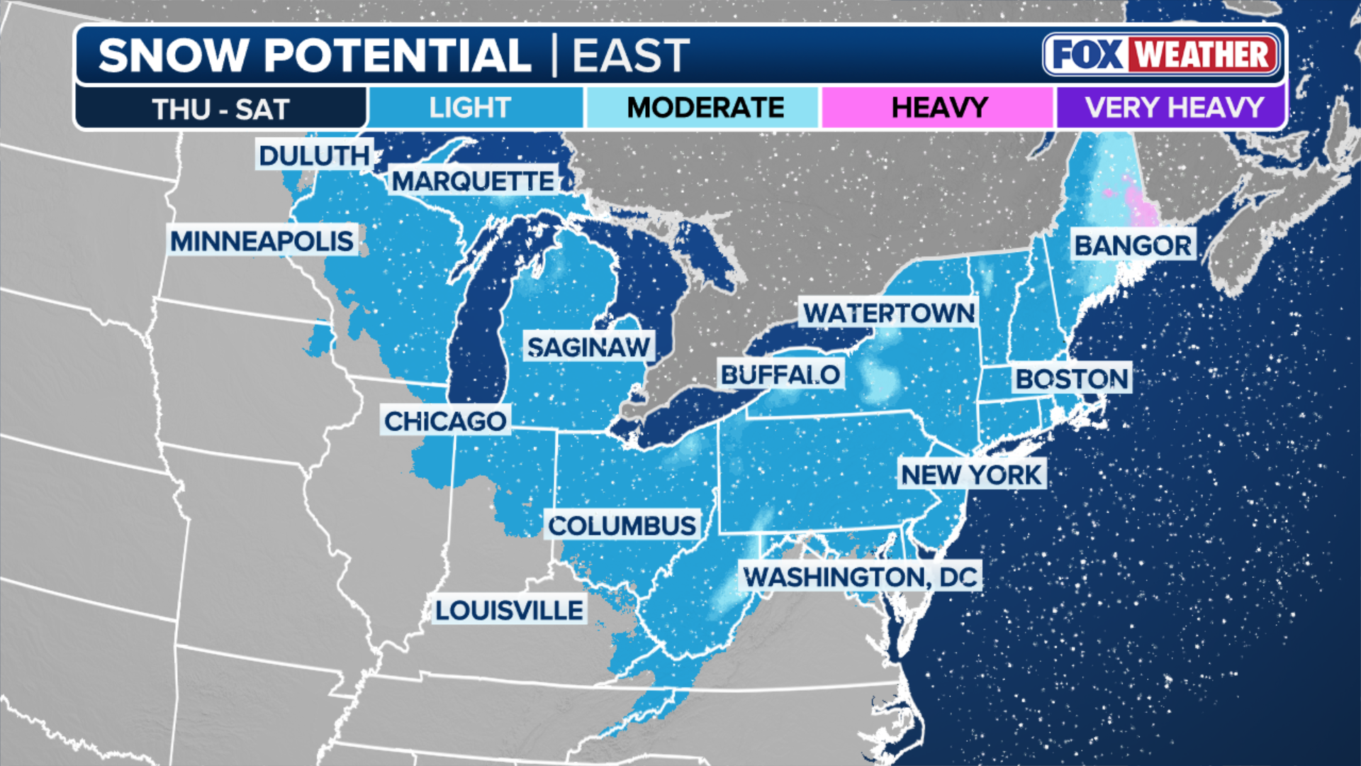 1–3 inches of snow are expected across the Great Lakes and Northeast, with higher amounts favored in elevated terrain, according to the FOX Forecast Center.
