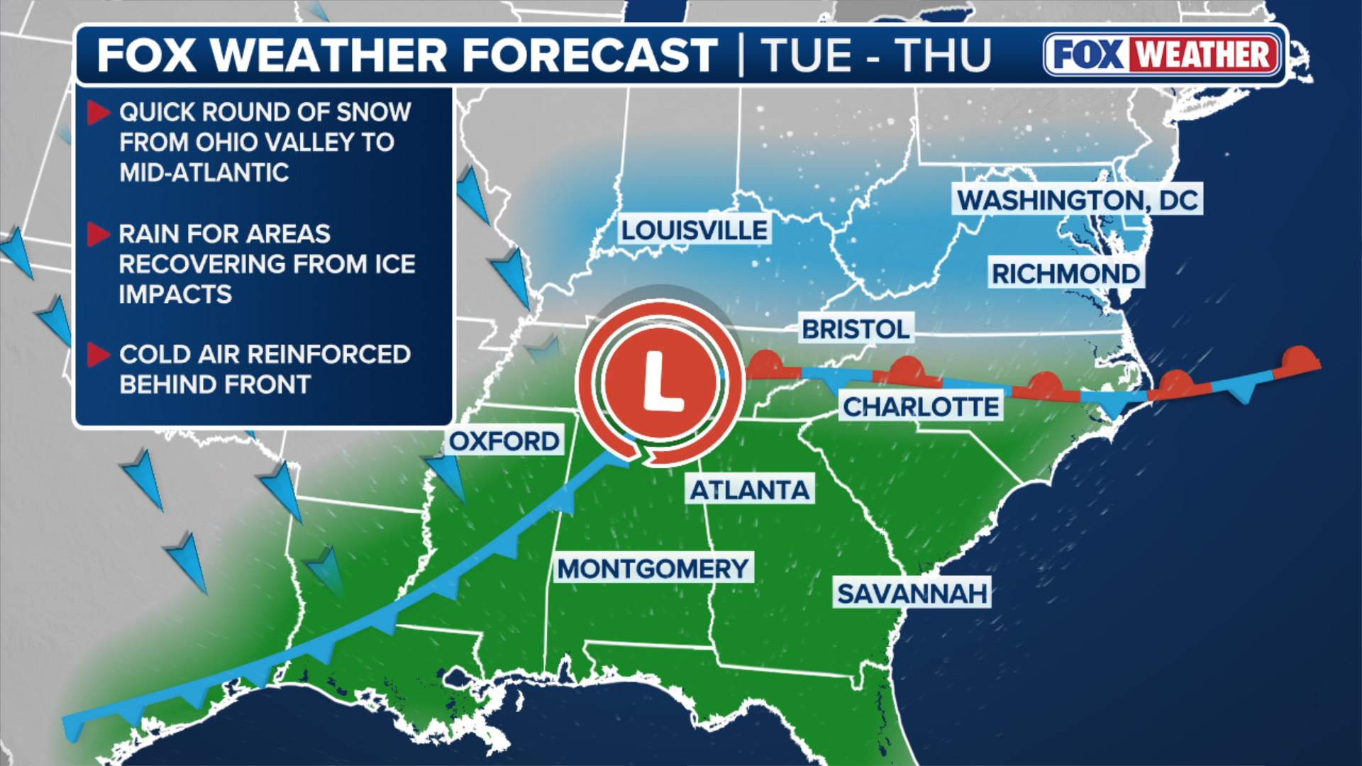 Midweek snow to clip Ohio Valley, Mid-Atlantic; rain to help melt remaining ice across the South
