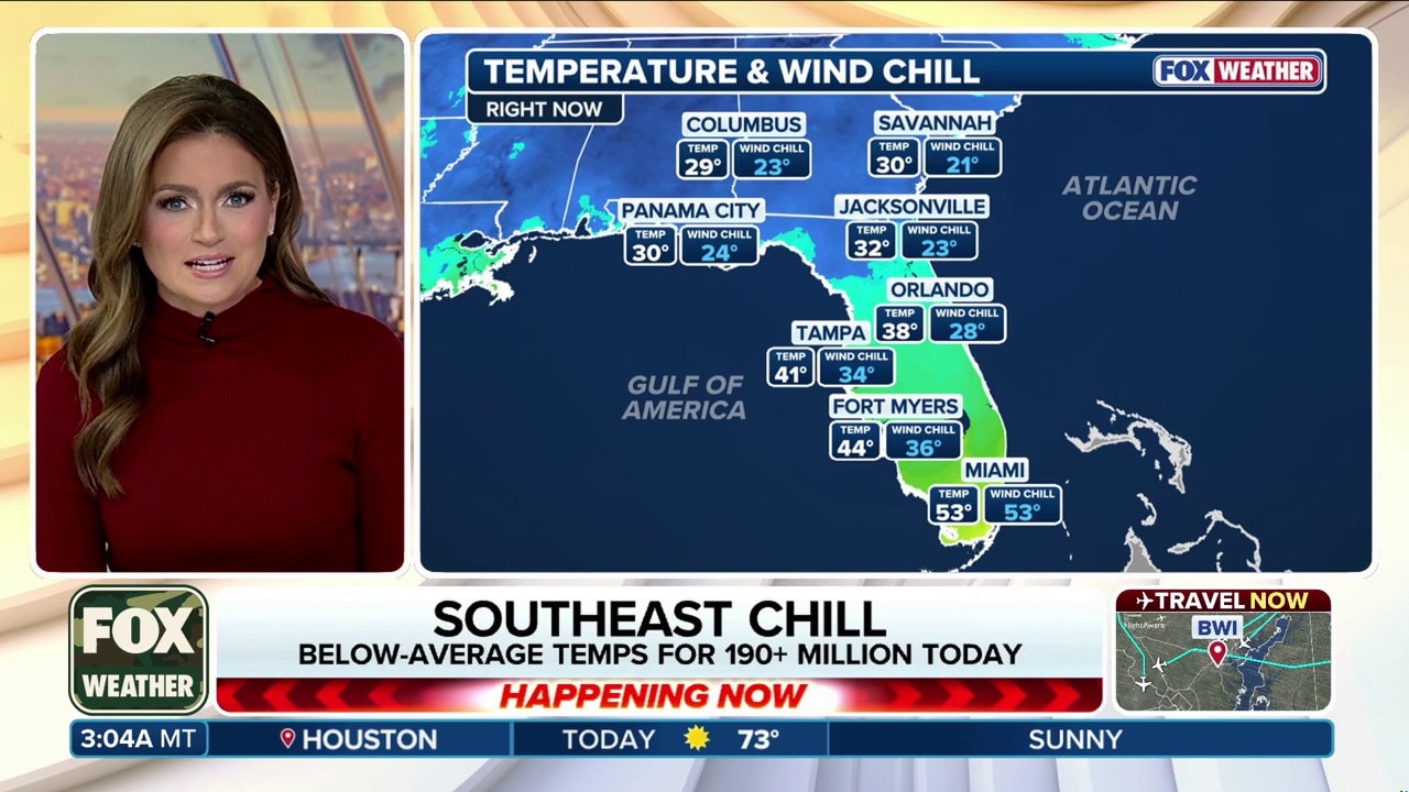 More than 190 million Americans woke up to cold temperatures Tuesday, with most people 15-25 degrees below average from the Plains across the eastern half of the U.S. Wind chills will drop feel-like temperatures into the teens for the Midwest and interior Northeast. Meanwhile, record low temperatures were recorded across parts of Florida Tuesday morning, as the coldest air of the season spread through the southern and southeastern part of the country.