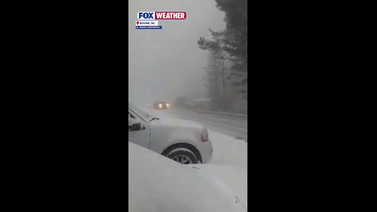The snow was heavy at times in the mountains of western North Carolina Monday, creating treacherous travel conditions on State Route 194 near Boone, an area that is still recovering from Hurricane Helene last year.