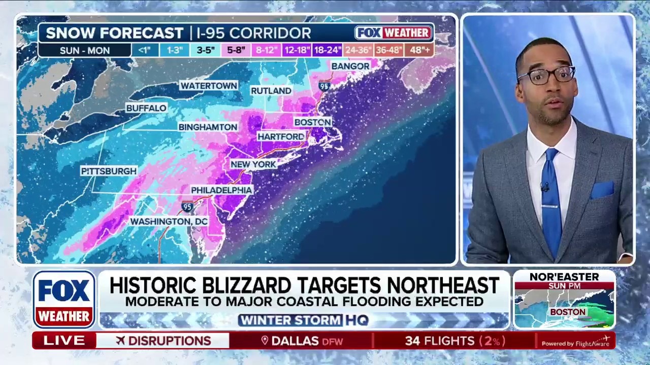 For the first time in nearly a decade, blizzard warnings have been issued for New York City as a historic storm targets the Northeast. Whiteout conditions are expected for the I-95 corridor Sunday and Monday, with the Big Apple, Boston and Philadelphia expected to see 12-18 inches of snow. Moderate to major coastal flooding is expected along the New York, New Jersey, Massachusetts, Connecticut and Delaware coasts. Stick with FOX Weather for all the latest developments: