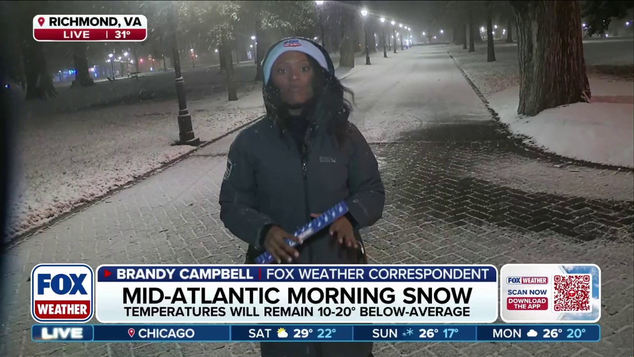 More than 16 million people are under Winter Weather Advisories in the mid-Atlantic, waking up to their first snow of the season in parts of Virginia and Maryland, which is creating slick travel conditions and delaying school openings across the region. FOX Weather Correspondent Brandy Campbell has the story from Richmond, Virginia.