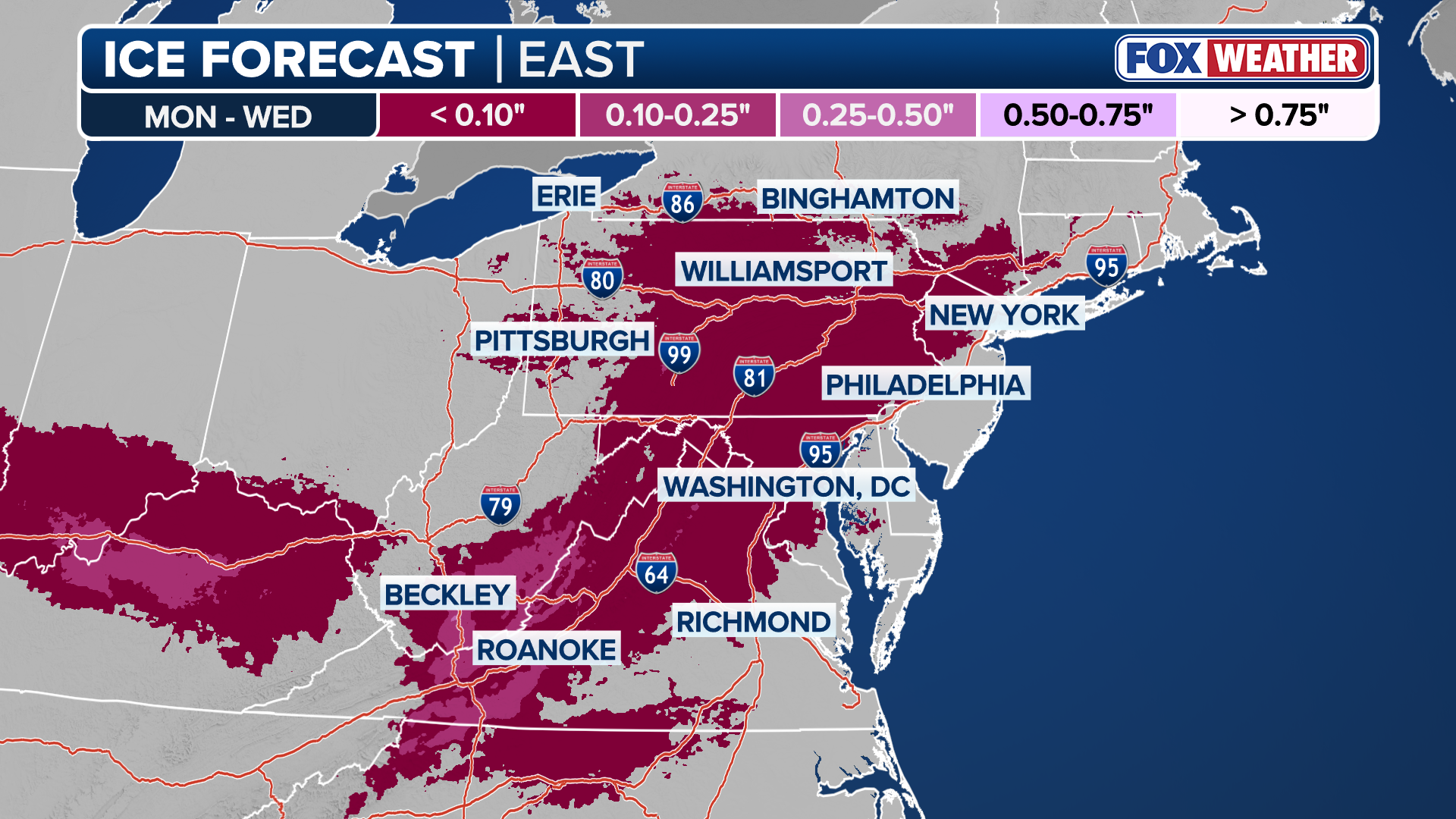 For bigger I-95 cities, New York City, Philadelphia, Baltimore and Washington DC would be on the fringe of snow, ice and rain, with Boston having the greatest chance of being in a longer stretch of snow.