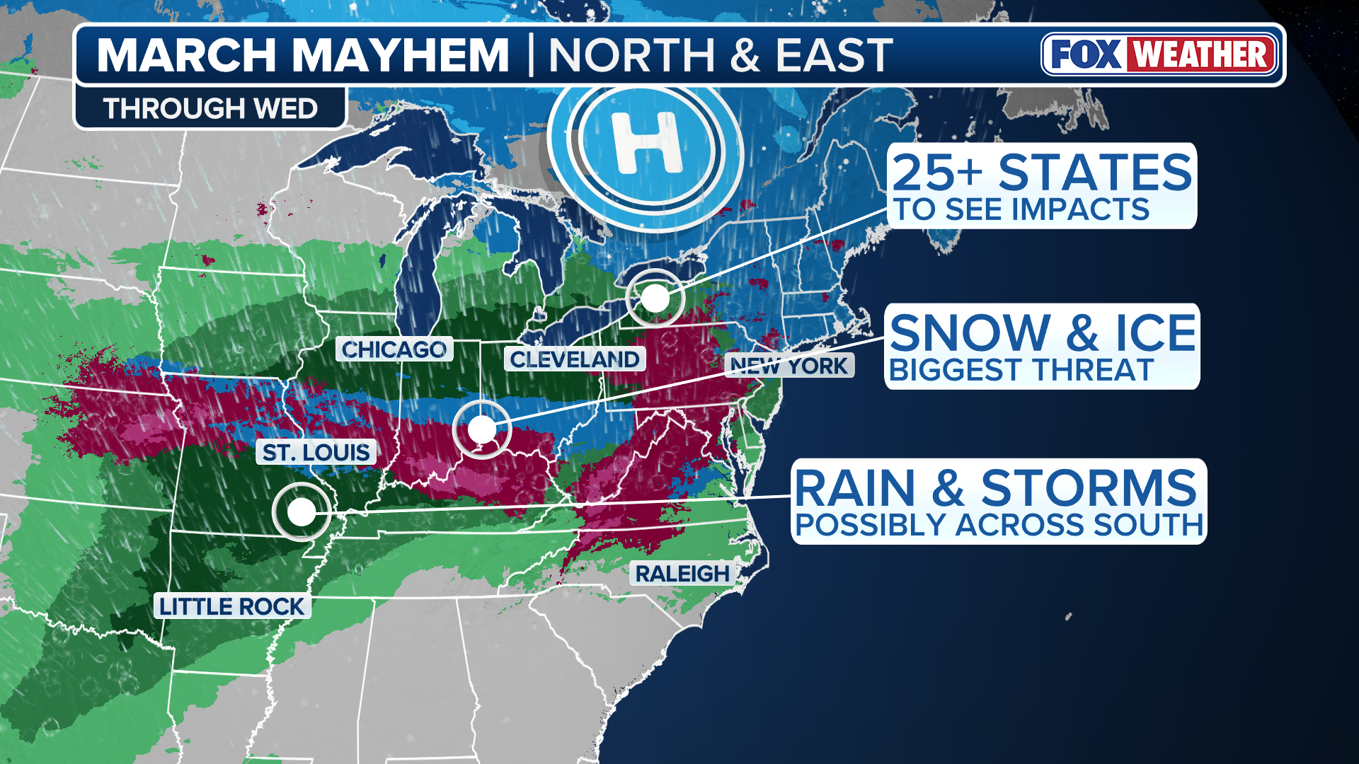 Round one of a three-storm sequence continues spreading snow across the Northern Tier, moving into the Northeast by Sunday morning. The system will bring snow, freezing rain, and ice, impacting the Midwest, Northeast, and Mid-Atlantic through Wednesday. Stay tuned to FOX Weather for the latest updates.