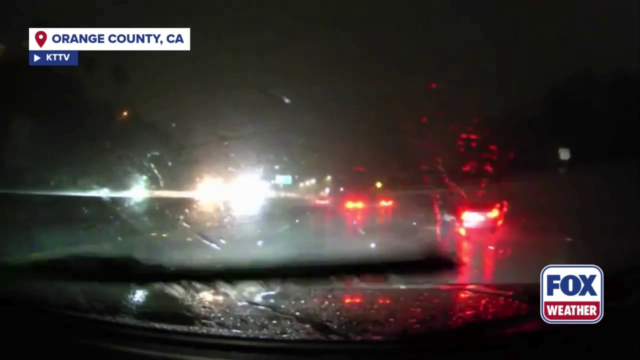 Heavy rain dropped visibility for drivers early Wednesday in Orange County, California, as a powerful storm with the potential for life-threatening flash flooding moved onshore.