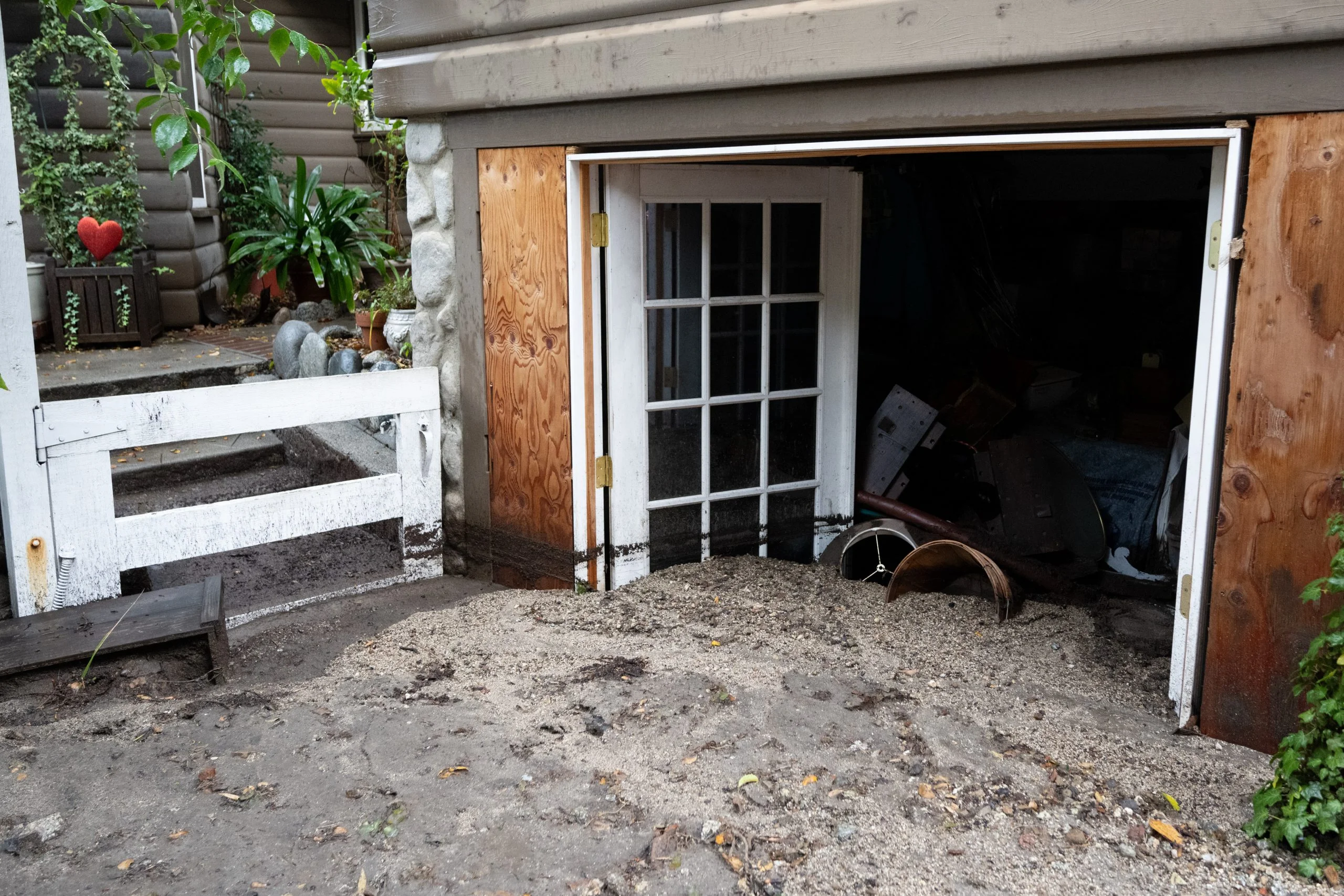 FILE - Sierra Madre, CA - February 14:A mudslide poured into this home along Sunnyslope Drive in Sierra Madre during heavy rains on Thursday. Over an Inch of rain fell Thursday over mountain areas burned by the Eaton fire causing several mudslides in the area.