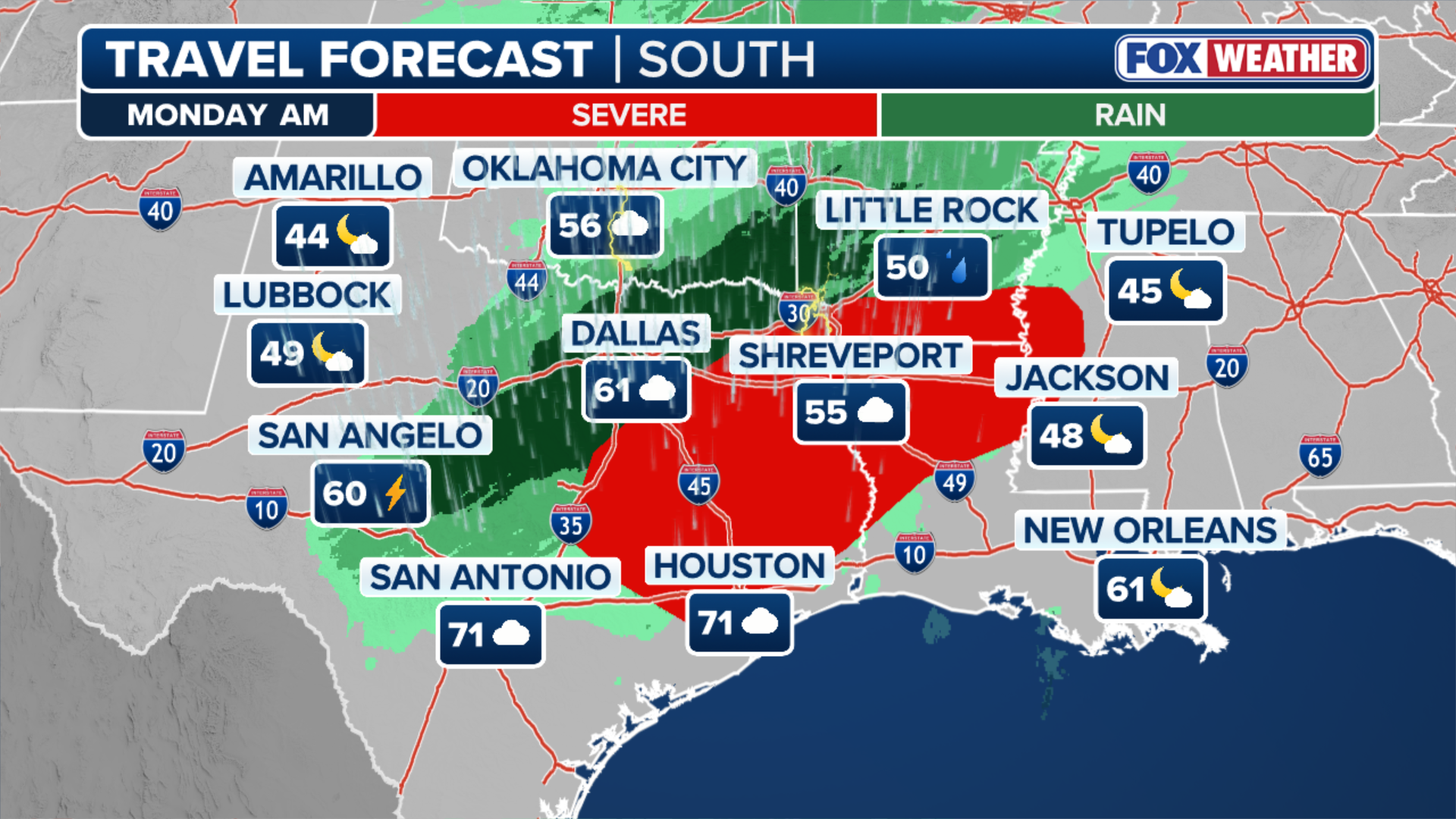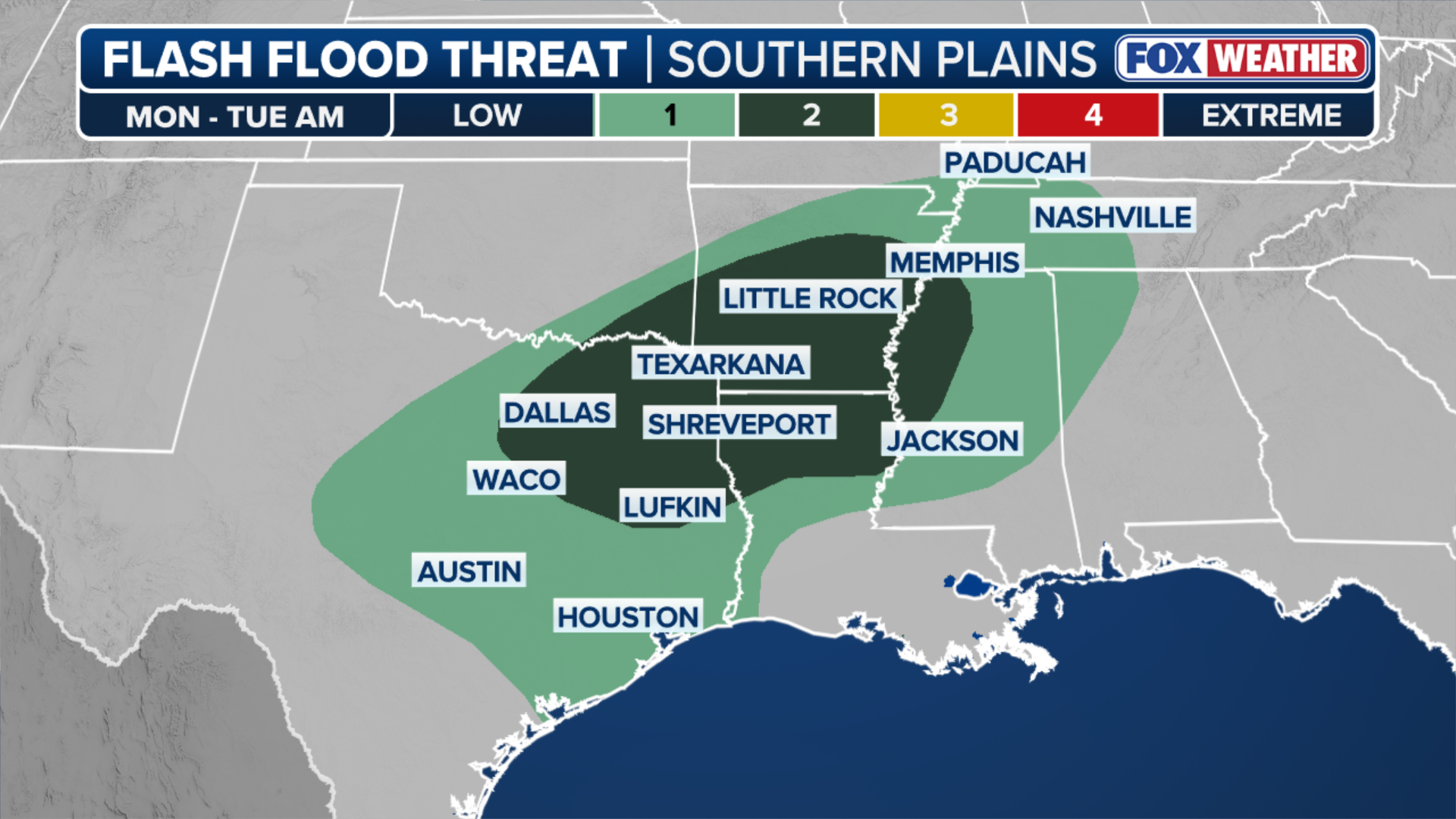 The greatest flood threat is concentrated in the Ark-La-Tex region, where NOAA's Weather Prediction Center has issued a Level 2 out of 4 Flash Flood Threat that includes Dallas, Shreveport, Louisiana, Little Rock, Arkansas, Jackson, Mississippi and Memphis, Tennessee.
