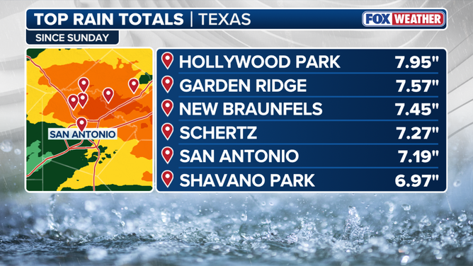 Over 9 inches of rain was reported on Monday just north of San Antonio due to trailing, slow-moving storms. Other locations have seen nearly half a foot of rain since Sunday.