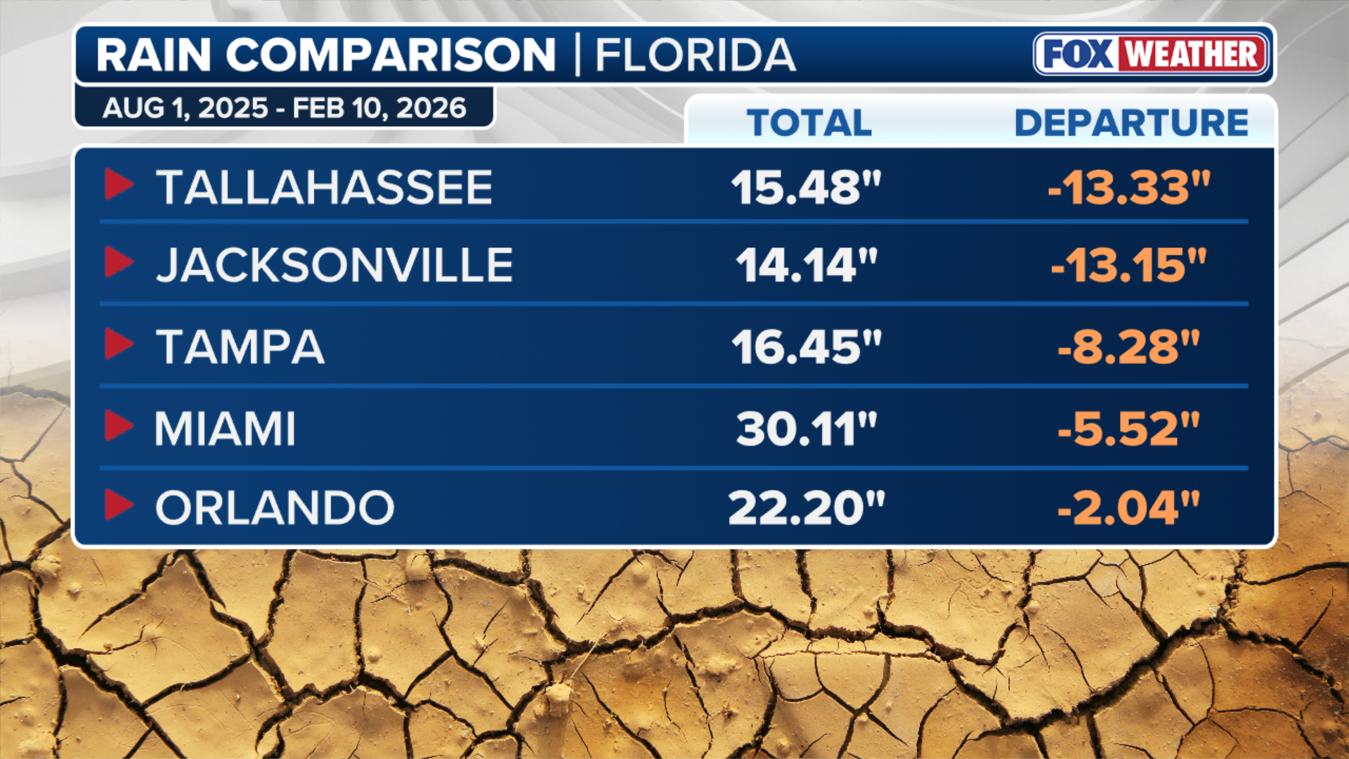 Jacksonville and Tallahassee have seen their rainfall deficits swell to more than 13 inches below average since last August.
