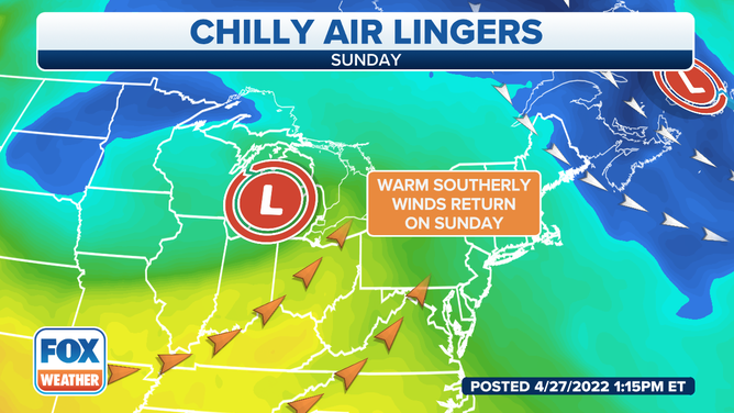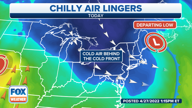 Temperatures will be in the upper 40s from areas of the Great Lakes, interior Northeast and northern New England, while southern New England and the New York City tri-state area will get into the 50s.