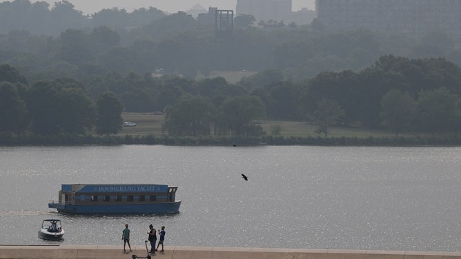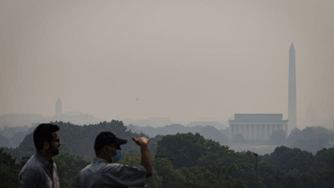 WASHINGTON, DC- JUNE 07: Hazy skies are seen over Arlington, VA as people are seen near the Potomac River on Wednesday June 07, 2023 in Washington, DC. Smoke from wildfires in Canada have darkened the skies and effected the air quality in some of the United States. (Photo by Matt McClain/The Washington Post via Getty Images)