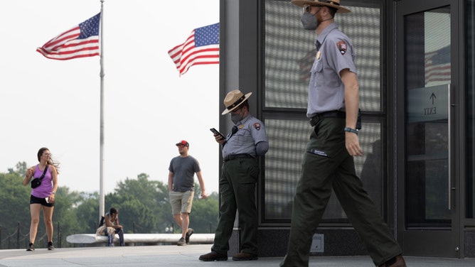 WASHINGTON - JUNE 7: Wearing protective face masks, U.S. Park Rangers stand at the base of the Washington Monument on Wednesday, June 7, 2023. Heavy smoke from Canadian wildfires were visible throughout the region Wednesday. (Photo by Tom Brenner for The Washington Post via Getty Images)
