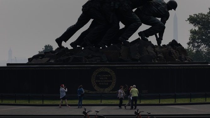 ARLINGTON - JUNE 7: Visitors walk along the Iwo Jima Marine Corps Memorial in Arlington, Va., on Wednesday, June 7, 2023. Heavy smoke from Canadian wildfires were visible throughout the region Wednesday. (Photo by Tom Brenner for The Washington Post via Getty Images)