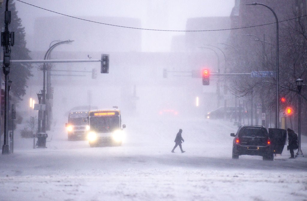 FILE - MINNEAPOLIS, MN - DECEMBER 23: A person walks through downtown as snow falls on December 23, 2020 in Minneapolis, Minnesota. Mid-forties temperatures this morning are giving way to high speed wind, low temperatures, and heavy snowfall, as blizzard warnings blanket the state.