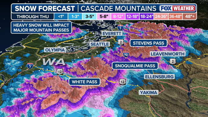 The Cascades could see feet of snow accumulation as multiple storms and colder air move into the area through Thursday.