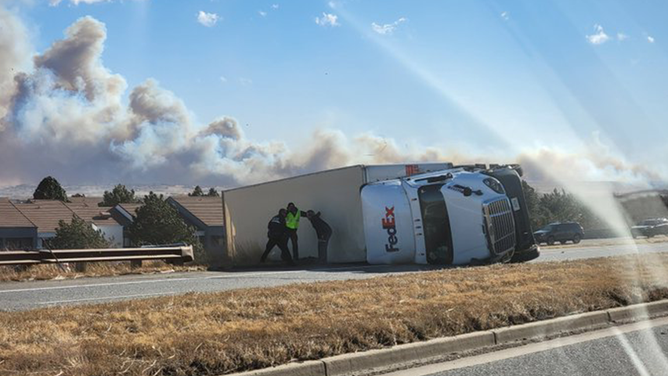 A tractor-trailer was blown over due to strong winds in the Boulder, Colorado, area as smoke from a grassfire rises in the background.