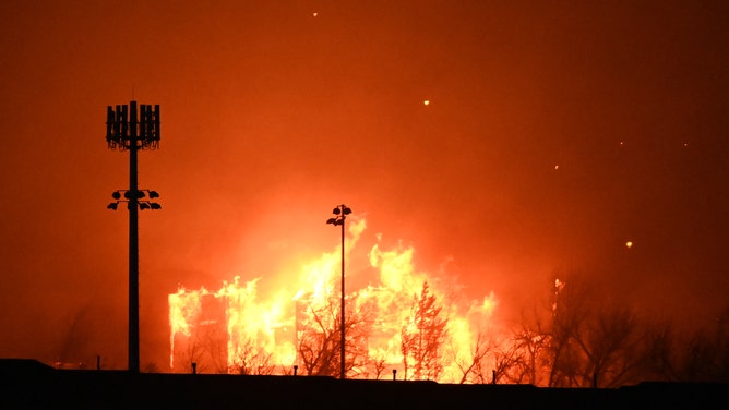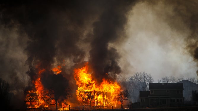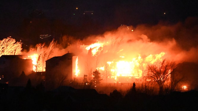 Flames engulf homes as the Marshall Fire spreads through a neighborhood in the town of Superior in Boulder County, Colorado on December 30, 2021. - Hundreds of homes are feared lost in fast-moving wildfires in the US state of Colorado, officials said Thursday, as flames tear through areas desiccated by a historic drought. At least 1,600 acres have burned in Boulder County, much of it suburban, with warnings that deaths and injuries were likely as the blaze engulfes hotels and shopping centers. Extreme winds topping 100 mph caused grass fires to quickly spread into the Colorado towns of Superior and Louisville resulting in the mandatory evacuation of over 30,000 residents. Colorado Governor Jared Polis has declared a state of emergency due to the grass fires in Boulder County. (Photo by Jason Connolly / AFP) (Photo by JASON CONNOLLY/AFP via Getty Images)