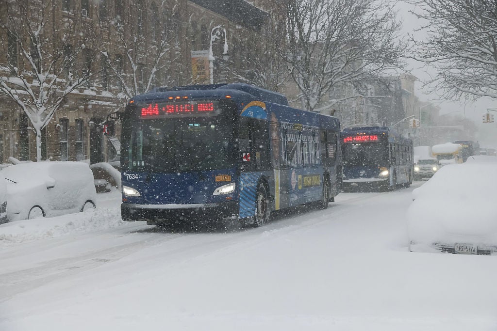 MTA buses during a winter storm in the Brooklyn borough of New York, US, on Monday, Feb. 23, 2026.