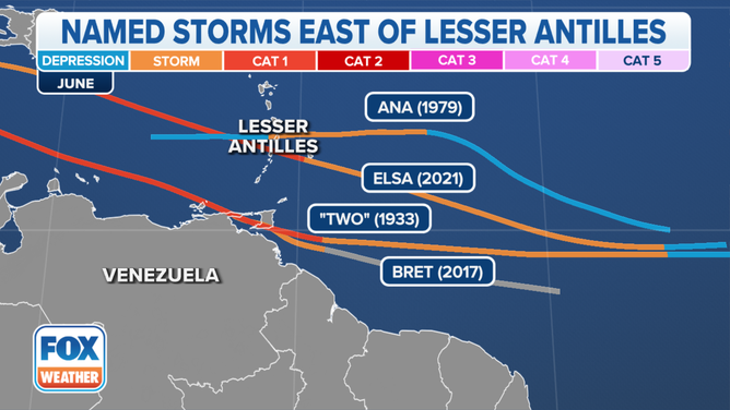 According to records dating back to 1850, there have been two tropical storms and two hurricanes that formed east of the Lesser Antilles in June.