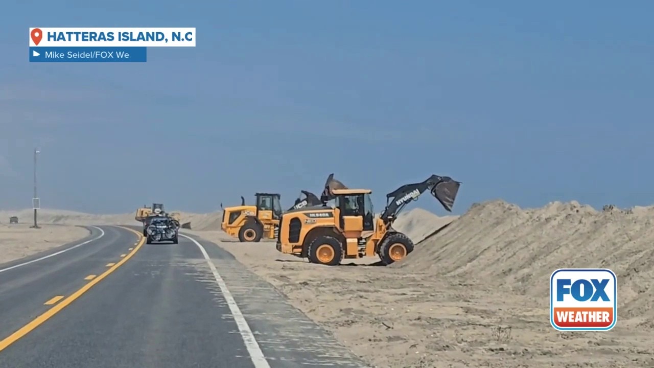 A video shared by FOX Weather Storm Specialist Mike Seidel shows crews working to build up the sand dunes on Highway 12 on Hatteras Island, North Carolina, ahead of impacts from Hurricane Erin.