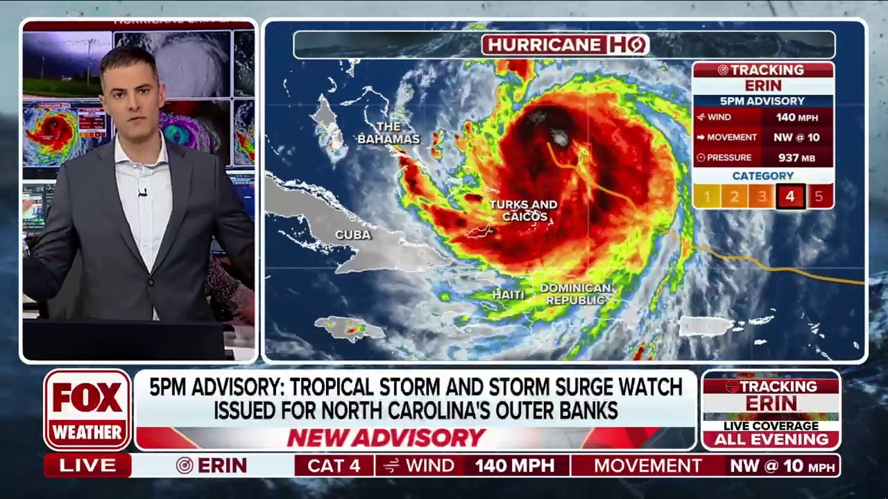 HATTERAS, N.C. – Tropical Storm and Storm Surge Watches have been issued for portions of North Carolina’s Outer Banks as extremely dangerous Hurricane Erin continues to barrel across the Atlantic as a major Category 4 hurricane.
