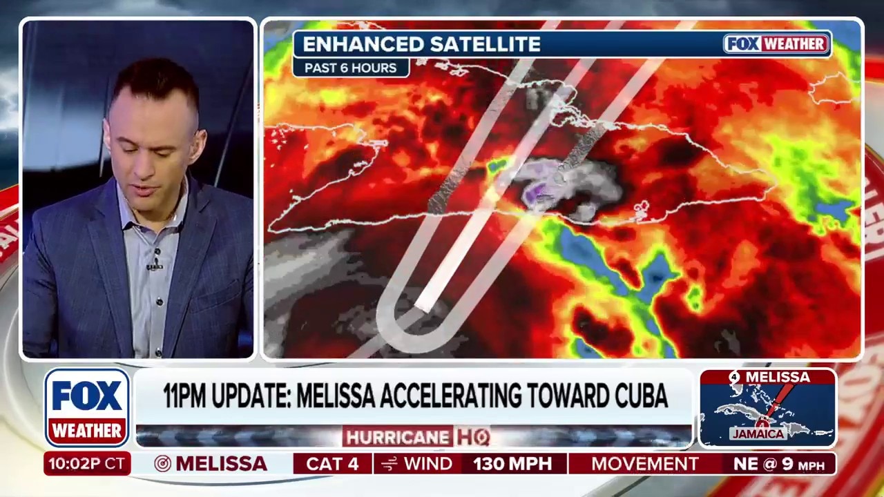 FOX Weather Meteorologist Ari Sarsalari provides the latest update on Hurricane Melissa as it heads toward Cuba as a Category 4 hurricane with sustained winds of 130 mph.