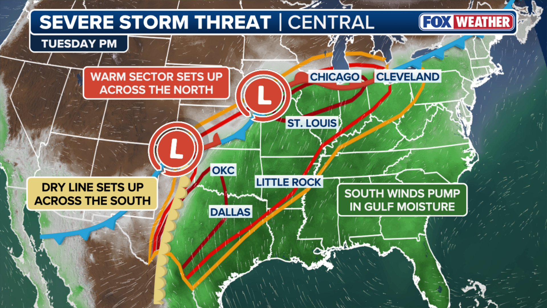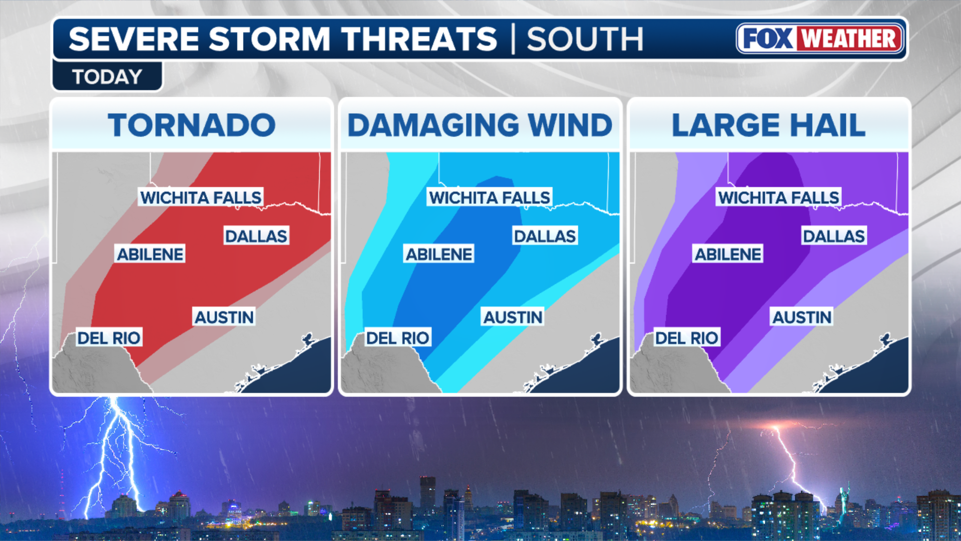 And a Level 2 out of 5 threat remains for Dallas, Texas; Detroit, Michigan; Indianapolis; Oklahoma City and Tulsa, Oklahoma; Kansas City, Missouri.