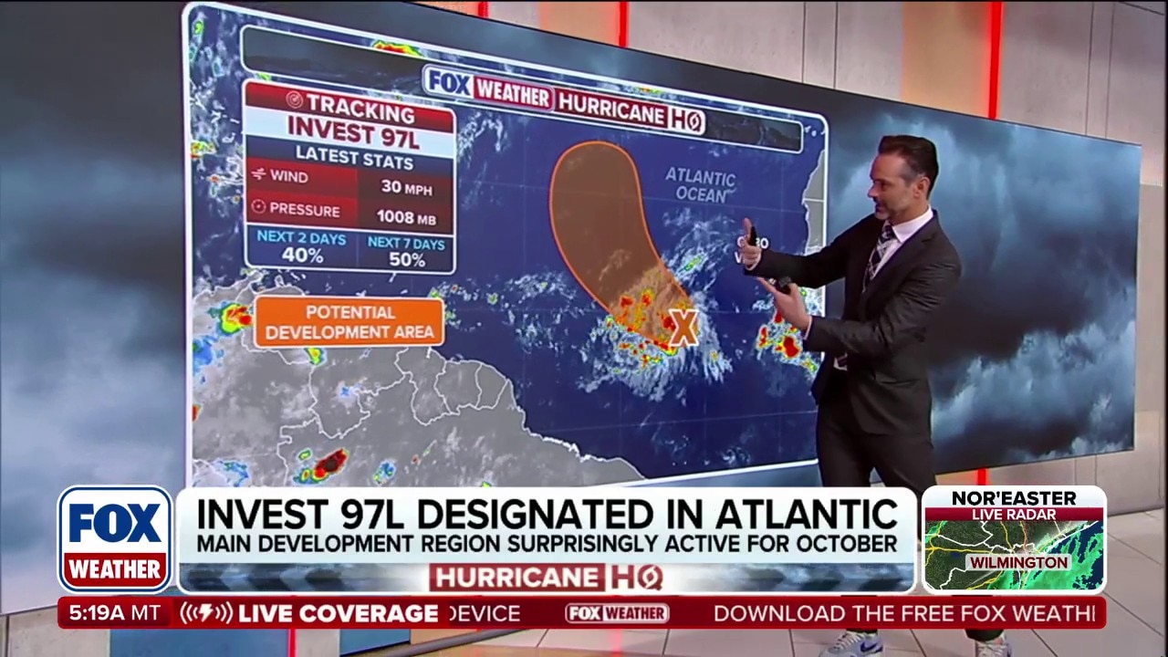The National Hurricane Center is monitoring newly-designated Invest 97L in the Atlantic, and forecasters say it could strengthen into our next tropical depression. FOX Weather Meteorologist Nick Kosir has the latest on Oct. 12, 2025.