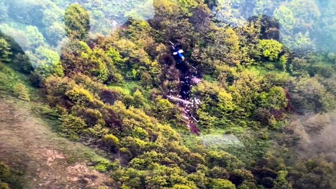 After an 18-hour search for the wreckage across a steep mountainous forest, a drone located the heat source from the president's helicopter that crashed into the hillside. Crews had to navigate by foot through the mud, heavy rain and fog to get to the charred pieces of helicopter spread over the area in the trees.