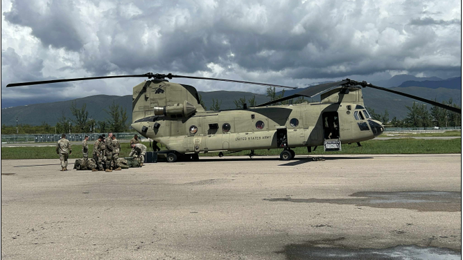 Three CH-47 Chinooks from the 1st Battalion, 228 Aviation Regiment, carried 40 service members and supplies arrive in Jamaica part of US disaster relief response.