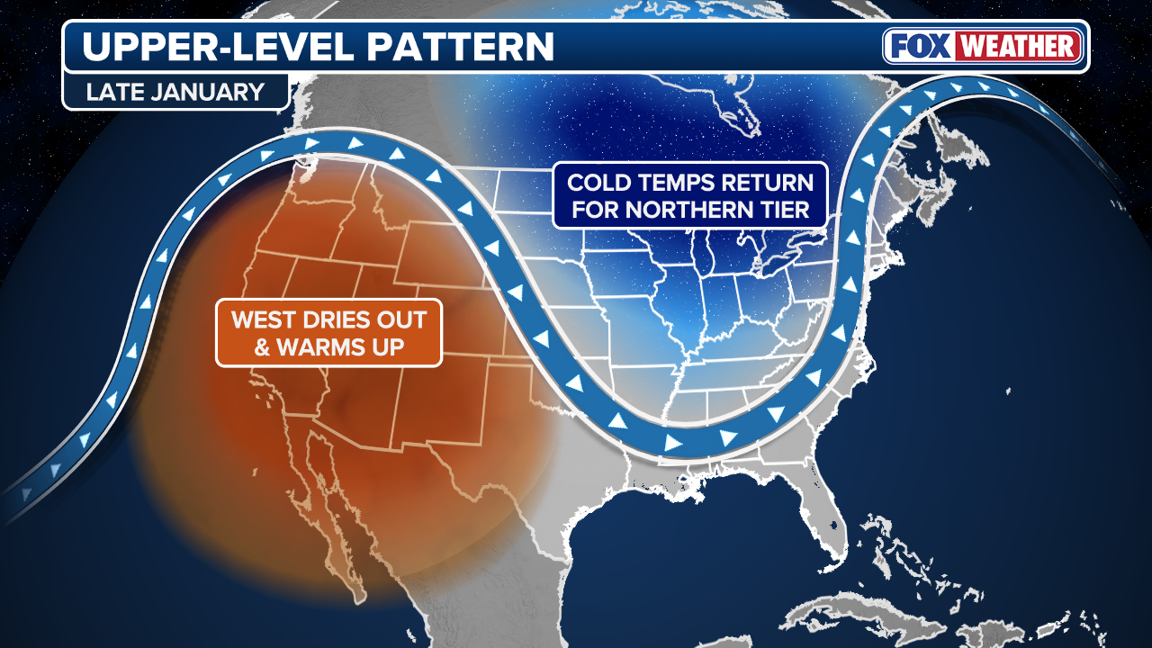 As the ridge strengthens in the West, the jet stream is expected to extend from southern Canada into the Southeast, similar to December's weather pattern. This setup increases the likelihood of colder air pushing into the Upper Midwest and Northeast, where below-average temperatures are expected in mid to late January.