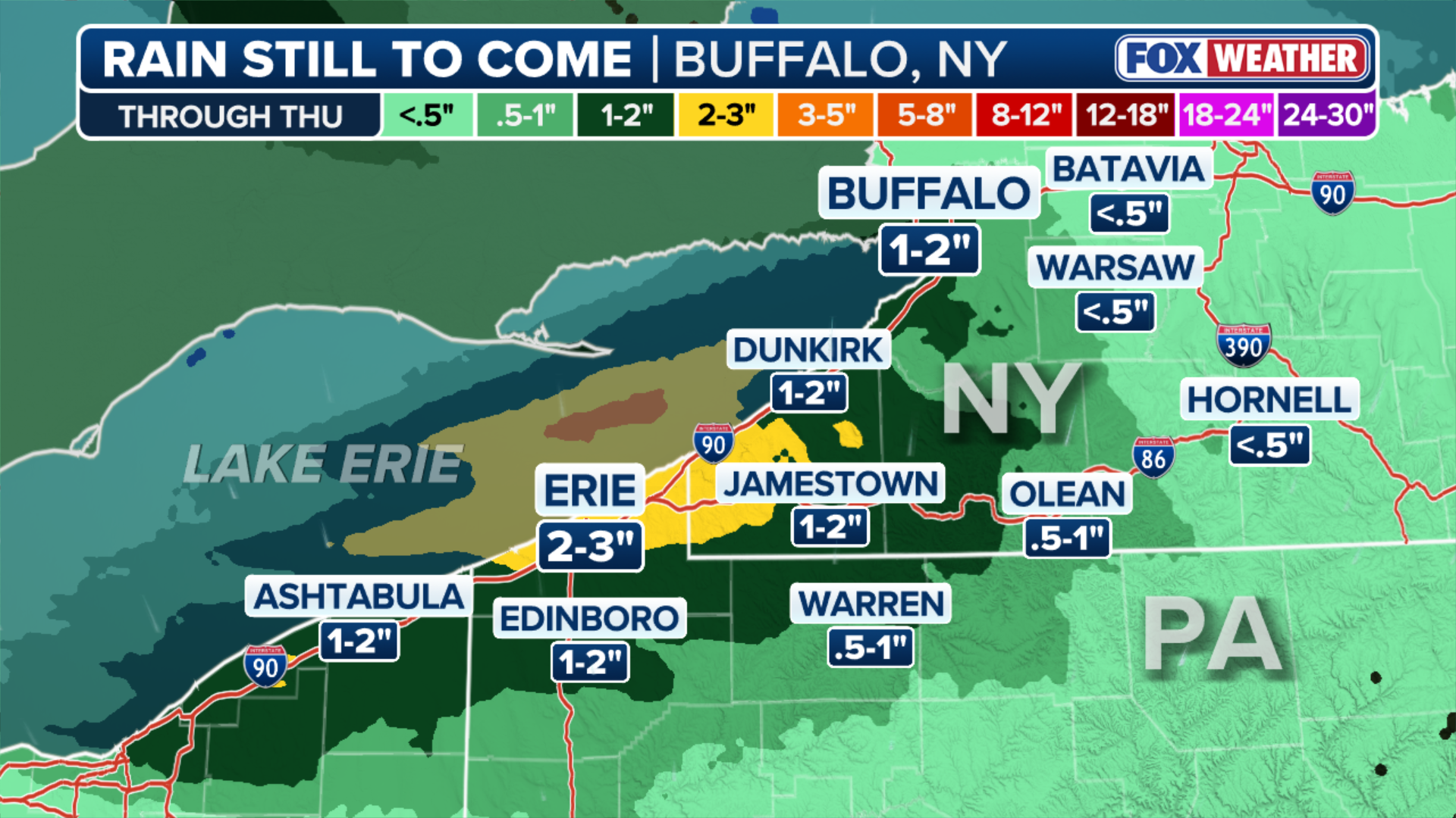 The National Weather Service offices in Buffalo, New York, and Cleveland are describing the setup as a "long-duration" and "prolonged" lake-effect rain event, respectively. A widespread 1-2 inches of rain, with locally up to 3 inches, is expected along the Interstate 90 corridor between Buffalo and Cleveland through the end of the week.