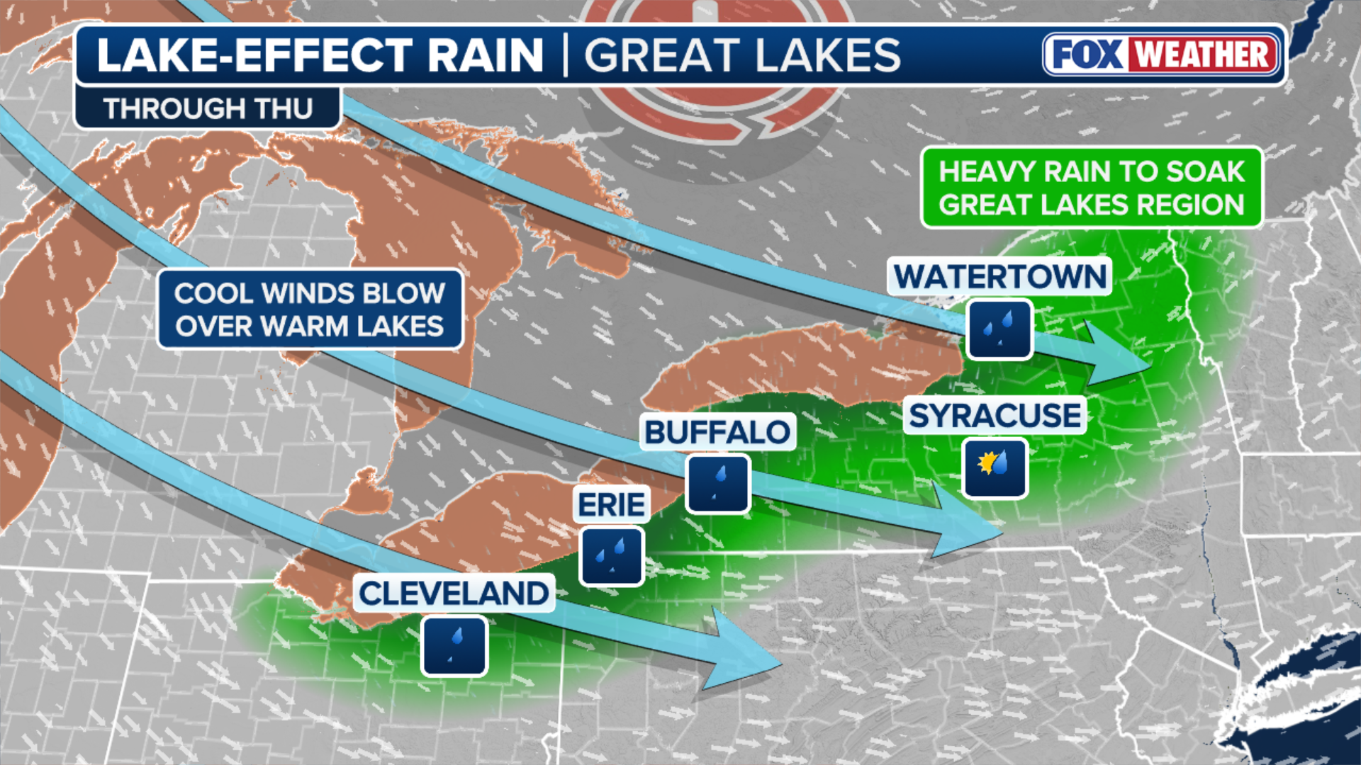 A low-pressure system over the Great Lakes region will trigger the development of lake-effect rain bands on the eastern sides of lakes Michigan, Erie and Ontario and the southern side of Lake Superior. A widespread 1-2 inches of rain, with locally up to 3 inches, is expected along the Interstate 90 corridor between Buffalo and Cleveland through the end of the week.