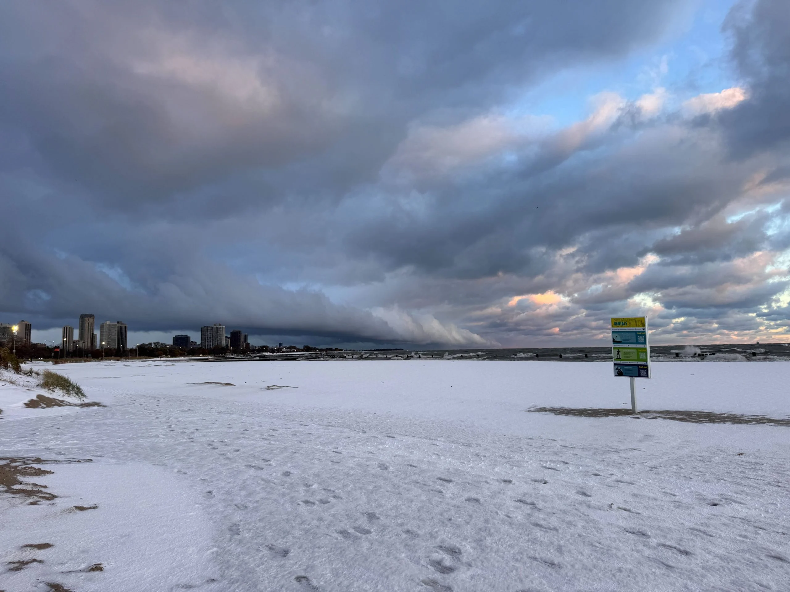 Another band of lake-effect snow looms in the distance over Lake Michigan in Chicago, after heavy bands of snow Sunday night.