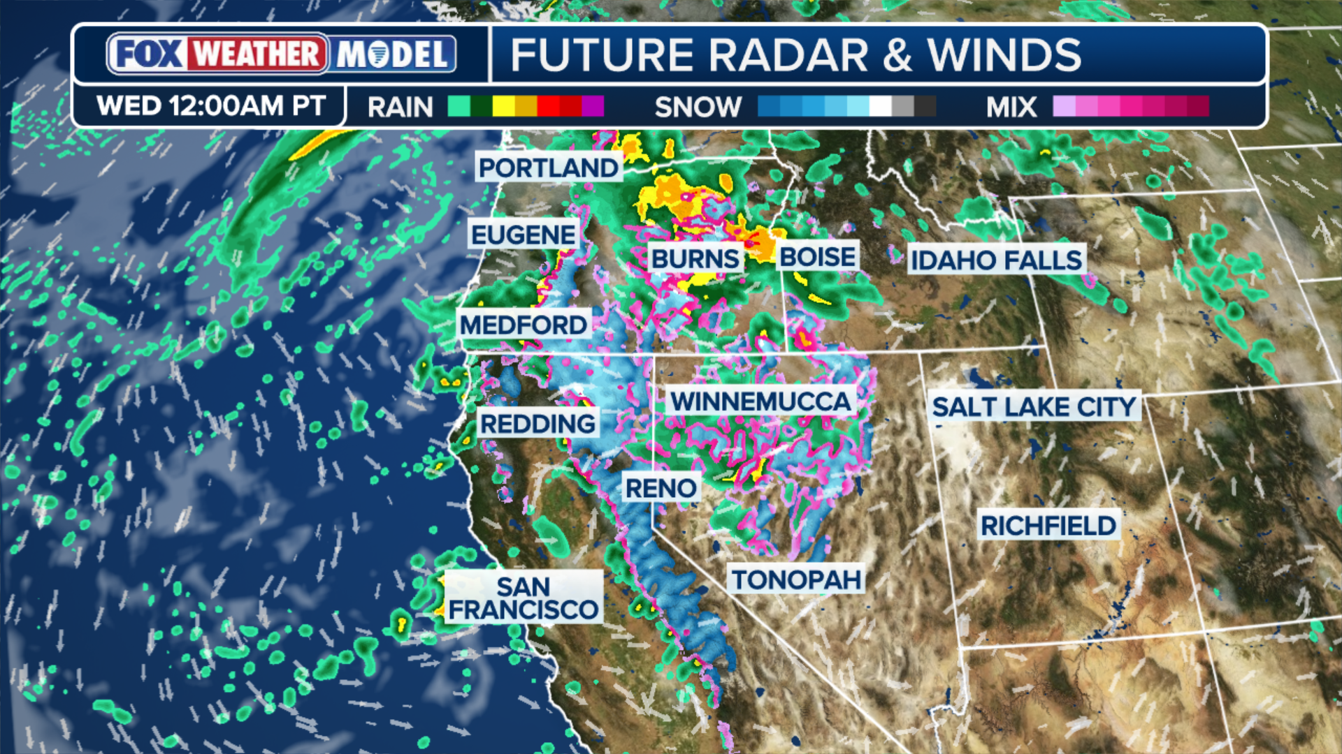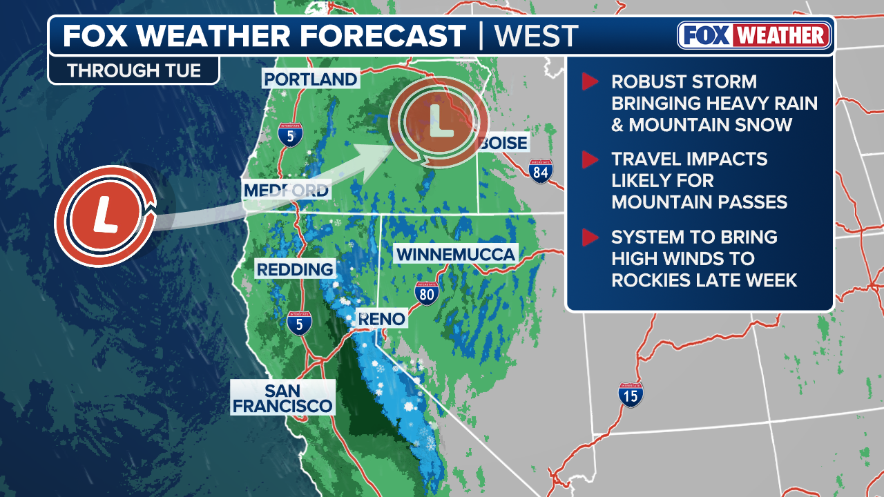 A Pacific storm system is bringing coastal rain, storms and mountain snow as it pushes across the Great Basin and Intermountain West. Winter Storm Warnings are in place across parts of California, along with wind alerts in place across Nevada and the Rockies. FOX Weather Meteorologists Craig Herrera and Britta Merwin break it all down: