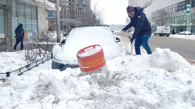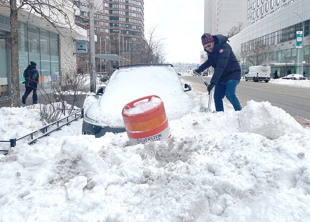 A man using a shovel to dig his car out after a snowstorm in New York City.